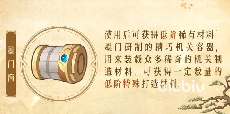 开局选择天工路线后,首推完成「天工开物图鉴」主线任务。该任务链将引导玩家解锁首个专属机关道具——墨门筒。该道具不仅是墨门机关体系的基础组件,更具备材料转化功能:消耗一定数量低阶墨门筒,可合成高纯度稀有材料。此外,墨门筒在日常副本、宗门巡检等活动中稳定产出,便于持续积累,为后续机关升级奠定资源基础。