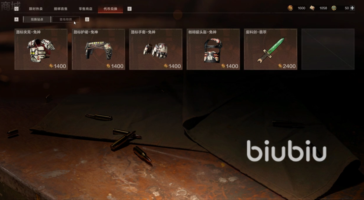 第二部分为代币兑换商店,主打“兔神”系列主题外观。该商店支持使用游戏内特定代币进行兑换,共上架五款物品:路标夹克、路标护裙、路标手套、咖啡罐头盔,以及废料剑皮肤。其中废料剑需消耗2400代币,其余四项各需1400代币。所有商品均为限时上架,代币不可跨赛季继承,请玩家及时规划使用。