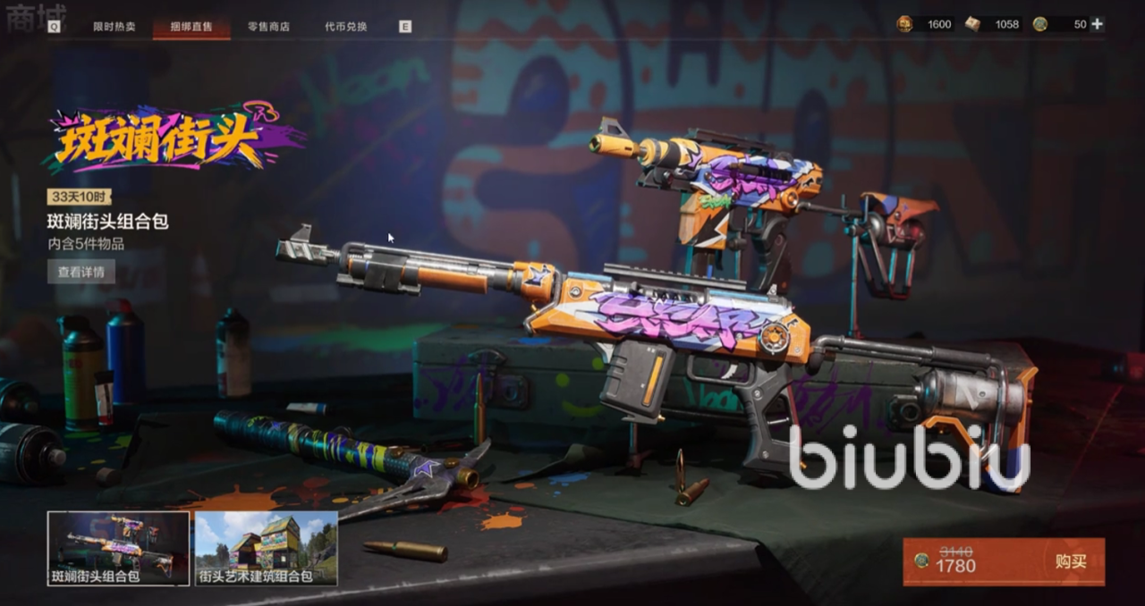第三部分为直购零售区,所有商品均需使用充值货币购买。当前上架内容包括:AK47浅灰沙滩皮肤、废料件、大砍刀、匕首及改名卡。此外还设有捆绑直售专区,本次主题为“斑斓街头”,包含街头艺术风格建筑组合套装,同步推出冲锋枪与半自动步枪两类武器皮肤。需特别注意:该区域所有商品均为独立售卖,不包含在赛季通行证奖励范围内,亦不可通过代币兑换获取。