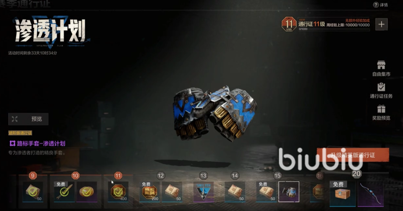 第一部分为赛季通行证系统,本季主题命名为“渗透计划”。该通行证包含多款以蓝色为主色调的定制化外观,覆盖近战与远程武器、护甲及功能性装备。具体可获得内容包括:蓝色猎弓皮肤、蓝色斧头皮肤、蓝色路标套装(含护甲与护裙),以及一款AK47突击步枪专属皮肤。所有通行证奖励均通过完成赛季任务逐步解锁,无需额外付费购买单件商品。