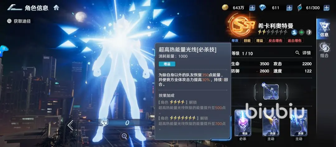 实战定位上,希卡利属于高速辅助型奥特曼。基础防御与生命值处于中游区间,不侧重单体承伤,而是通过机制联动提升全队持续作战能力。他具备稳定治疗效果、团队增益施加及能量循环调控等关键能力,同时拥有扎实的光线技与近战格斗技巧,智慧属性直接转化为战术适配性。