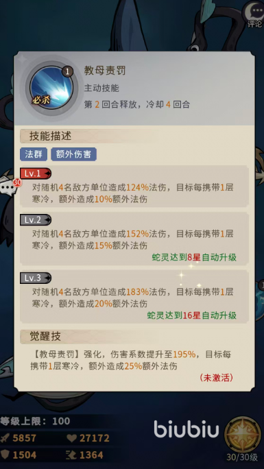 完成觉醒后,「仙灵术」全面升级:基础伤害系数提升至146%,冰冻触发概率跃升至50%,寒冷施加概率同步提高至85%。另一关键主动技「教母责罚」为高倍率群攻必杀技,初始对随机4名敌人造成124%法术伤害;每命中一名携带「寒冷」状态的目标,额外附加10%法伤。觉醒后,该技能基础伤害提升至195%,且每层「寒冷」可额外触发25%法伤加成,形成极强的状态联动爆发链。