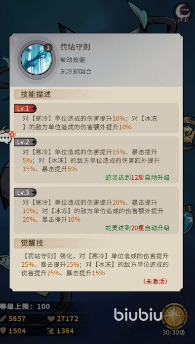 终极被动「罚站守则」实现精准伤害转化:对处于「寒冷」状态的敌人提升10%伤害,对已被「冰冻」的目标额外再增10%伤害。该效果需前置挂上寒冷/冰冻方可生效,因此在技能循环中应置于末位使用以最大化收益。当蛇灵升至20星后,该被动进一步强化:对寒冷目标伤害提升20%、暴击率提升10%;对冰冻目标同样获得20%伤害加成与10%暴击率提升,显著放大其终结能力。