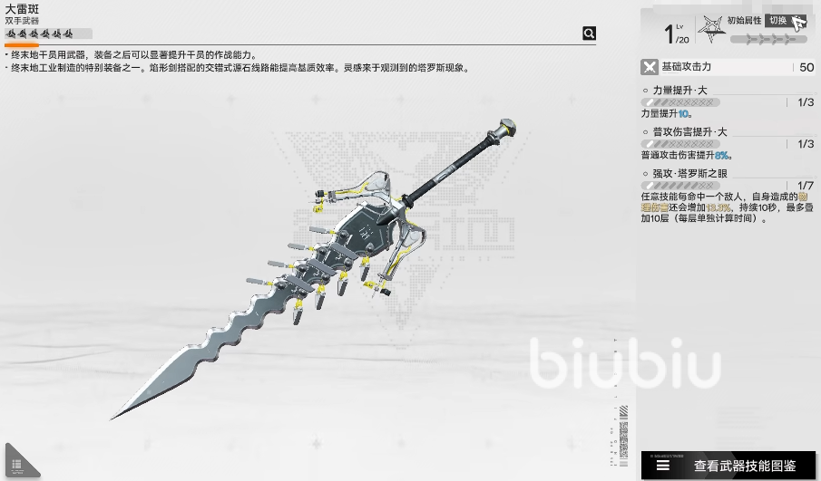 第二款推荐为「大雷斑」,同属双手武器,提供90%力量加成与69%普攻强化。其主动技能“塔罗斯之言”可在每次普攻命中时叠加物理伤害增益,每层提升60%物理伤害,持续10秒,最多叠加10层。各层持续时间独立计算,适合高频普攻、依赖多段输出的近战六星干员,如重装或强攻系角色。