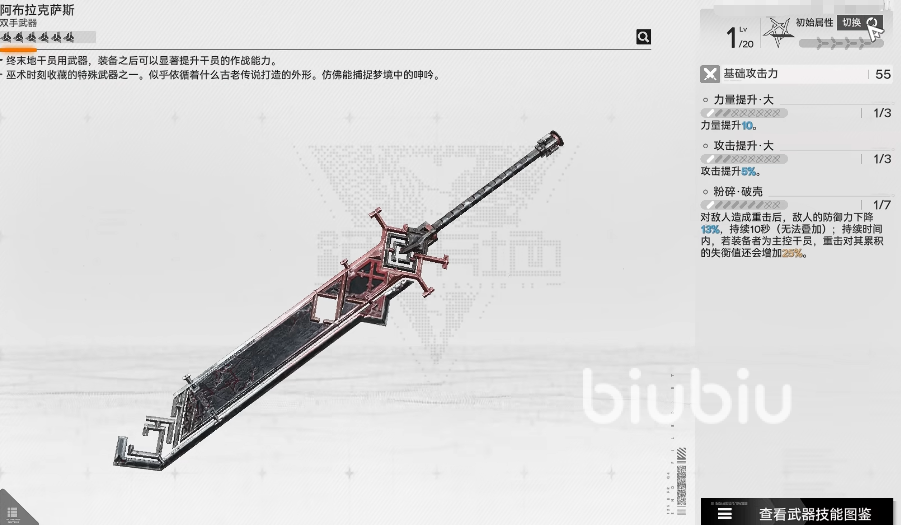 第三款为「阿布拉克萨斯」,初始力量+15%、攻击+8%,数值偏低但机制突出。其技能“粉碎破壳”可使被击中敌人防御降低13%,并累计失衡值——10秒内对同一目标多次重击可叠加至20%失衡值。该武器专精控制链构建,尤其适配需快速触发眩晕、倒地等硬控效果的六星术士或特种干员。