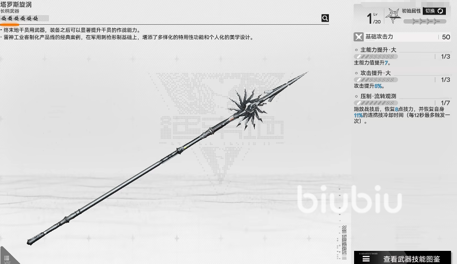 第四款「塔洛斯漩涡」为长柄类武器,基础攻击+7%、攻速+6%。其被动技能“压制流转观测”可在干员静止时每8点精力恢复,缩短连接器类技能11%冷却时间,每12秒最多触发一次。该机制稀缺性强,是当前少数可实质性优化关键技能循环节奏的武器,适用于依赖连接器衔接爆发的六星先锋或辅助干员。