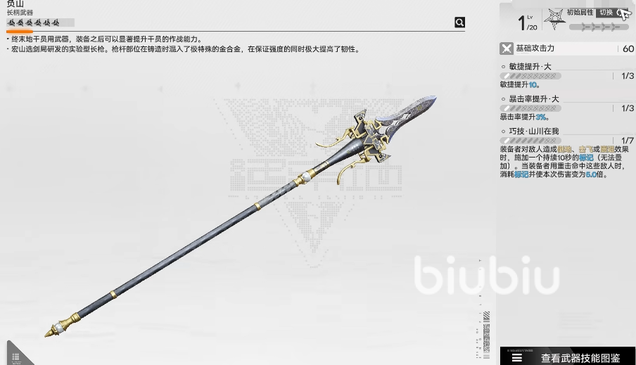 第五款「负山」提升敏捷10%、暴击率5%(基础值,随等级成长递增)。其技能“山川在我”可在造成倒地或击飞效果时,为目标施加持续10秒的不可驱散标记;装备者对已标记目标发动重击时,每消耗1层标记可获得5倍伤害增幅。该机制强调状态前置与爆发收割配合,契合高机动性、强控制衔接能力的六星近卫或特种干员。