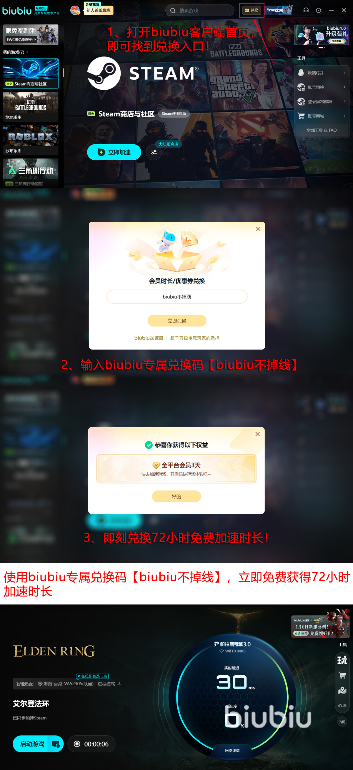 送的福利如下,有新人专属的24h服务时间用,这个需要注册然后登录才能领取,然后额外福利是有72h,这个需要用【biubiu不掉线】才能领,叠加后新人综合能用的服务时间有96h,足够充实了。