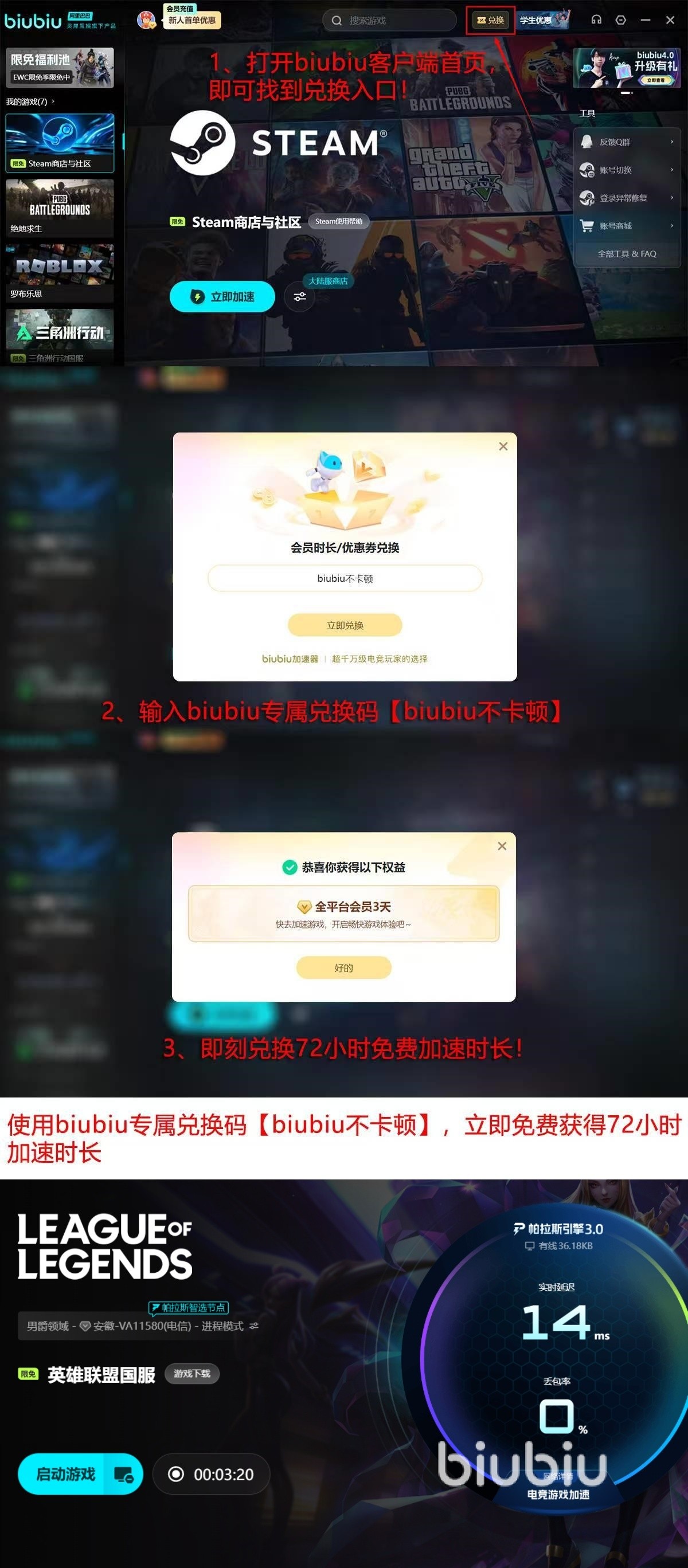 最近biubiu还有着不少的福利活动。第一个便是新用户进行注册的话,那可以获取到24小时的免费加速时间。使用兑换码【biubiu不卡顿】后我们还可以额外获取到3天的免费加速时间,总计可以获取到4天的免费加速。