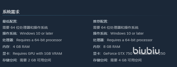 根据Steam官方页面公示的系统信息,本作最低运行配置为:Windows 10及以上操作系统,4GB RAM,存储空间约2GB;推荐配置则需搭载GTX 750 Ti或同级显卡,内存建议保持在4GB以上,安装容量扩展至4GB可保障高画质稳定运行。游戏整体美术风格清新柔和,对硬件压力较低,主流设备均可流畅启动。