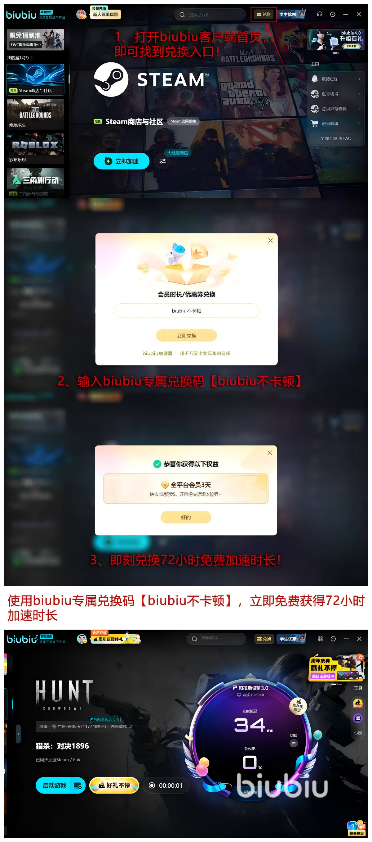 输入口令【biubiu不卡顿】即可领取72小时加速时长,新注册用户默认获赠24小时体验权益,叠加后总计可达96小时,为首次使用者提供充分的功能试用周期。