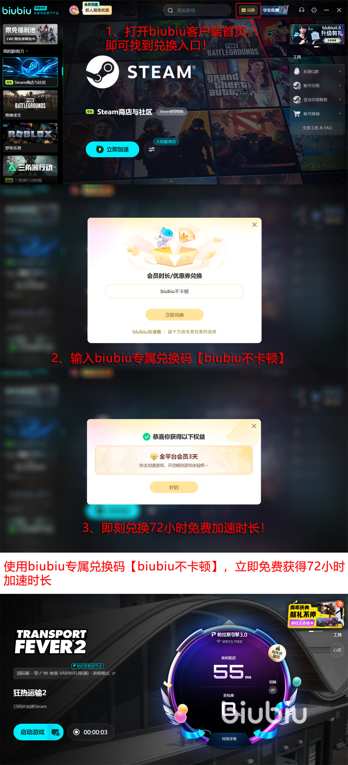 关于使用成本,biubiu采用会员订阅制,新注册用户可直接领取24小时全功能免费试用权限,无需预充值即可完成效果评估。此外平台提供通用型兑换码福利,所有账号均可使用一次,输入【biubiu不卡顿】即可激活额外72小时加速时长。两项权益叠加后,新用户可累计获得96小时连续使用周期,充分覆盖多场景压力测试需求。