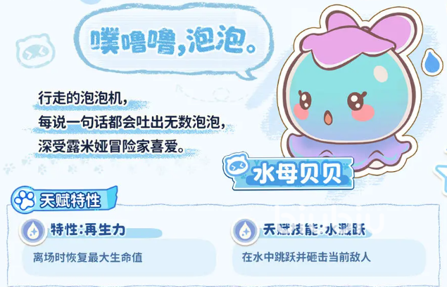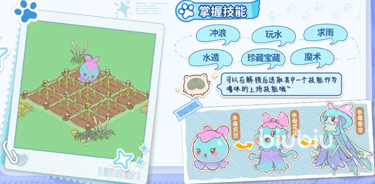 水系代表宠“水母贝贝”以生存辅助与环境互动见长,外观亲和力强,行动时伴有动态泡泡特效。其核心特性为【再生返场】——离场后立即恢复一定比例最大生命值并重返战场;天赋技能【水中跳跃攻击】可从空中下坠打击指定区域,触发水系震荡效果。该宠在休闲玩法中表现突出,例如通过【求雨】机制为农田作物补充水分;战斗中还可展开【水盾】,提供短时减伤与抗控效果。进化链为:水母贝贝 → 水母花花 → 水母奈奈,终阶形态全面强化治疗量、护盾强度与群体控场能力。