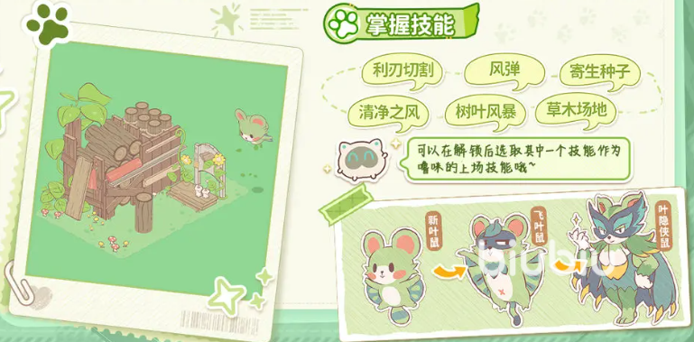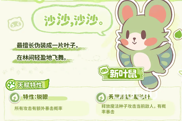 风系代表宠“新叶鼠”主打高暴击率与灵活位移,特性【锐眼】使其所有攻击均额外提升暴击概率;天赋技能【魔法叶】在命中时播撒种子,不仅造成基础伤害,还进一步叠加暴击触发率。双机制叠加下,该宠暴击覆盖率显著高于同阶其他角色。中后期可解锁【利刃切割】(远程单体)、【风弹】(高频连射)、【寄生种子】(延迟爆炸)及【树叶风暴】(大范围AOE)等技能组合,形成多层次输出体系。进化路径为:新叶鼠 → 飞叶鼠 → 隐身侠鼠,终阶获得隐身突袭与暴击增益延长效果。