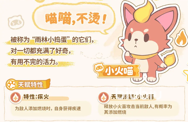 当前版本中,火系、水系与风系三大属性体系各具特色,其中火系代表宠“小火喵”凭借稳定的持续伤害与机动性成为新手过渡首选。其基础特性为【燃烧蔓延】,可对目标施加多段灼烧效果;天赋技能【小火苗】则在每次普攻后生成一枚附着火种,持续造成范围燃烧伤害。该角色具备明确的进阶路径:小火喵 → 火喵 → 双刃炎猫,最终形态解锁【烈焰怒袭】,大幅提升单体爆发频率与瞬时输出能力。