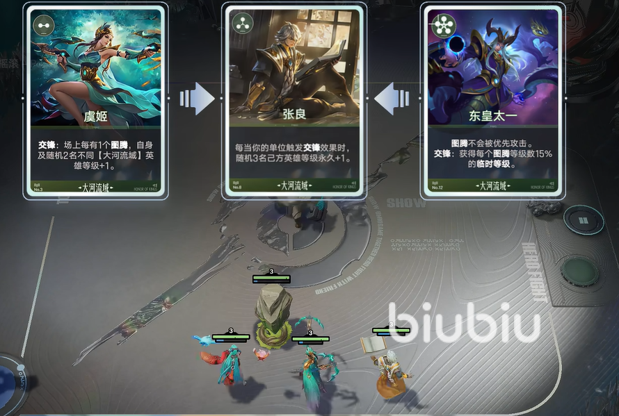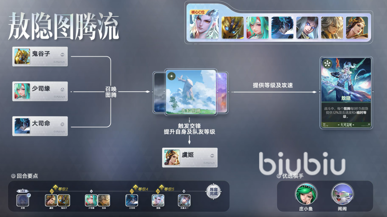 阵容骨架由鬼谷子、大司命、少司缘三人构成,三者均具备稳定召唤图腾的能力,是整套体系运转的基石。虞姬承担等级转化中枢职能——每存在1个图腾,全队基础等级即提升1级,图腾总数越多,升级效率越显著。张良提供关键辅助升级效果;东皇太一则可基于场上图腾数量获得临时等级加成。当虞姬与东皇太一触发交锋时,将联动张良技能,在单回合内实现多次连跳升级,节奏爆发力极强。真正进入大后期后,敖隐成为绝对核心:其攻速、技能等级、回血量全部与图腾总数直接挂钩,图腾堆叠至10+时,配合高阶技能,持续站桩输出即可完成全场清剿。