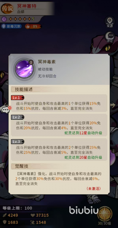 完成觉醒后,【冥神诅咒】进一步强化:伤害提升至188%物理伤害,【沉默】触发概率提高至70%,大幅增强控场稳定性。二技能【血蟒冲撞】为群体物理伤害技能,初始可对敌方全体造成83%物理伤害,并额外附加冥神塞特最大生命值5%的追加伤害,且有40%概率施加【剧毒】。当蛇灵星级达到16星时,该技能升级为对敌方全体造成134%物理伤害,追加伤害提升至自身最大生命值9%,【剧毒】附加概率同步提升至60%,并在命中后驱散我方随机1名单位的所有负面状态。觉醒后,【血蟒冲撞】再次进化:伤害提升至144%+10%物理伤害,驱散范围扩大至我方随机2名单位的全部负面效果,配合其被动【血蟒体质】——该被动在18星时提供45%最大生命值与25%攻击力加成,显著提升生存与输出双维度表现。