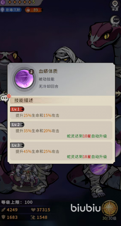 其一技能【冥神诅咒】为单体物理攻击技能,基础形态可对敌方前排目标造成122%物理伤害,并附加【剧毒】状态;升至3级后,伤害提升至176%物理伤害,同时赋予【剧毒】,并有55%概率追加【沉默】效果,持续2回合。【剧毒】状态使目标法术免伤降低5%,且每回合结束时损失自身最大生命值的5%,单次扣除上限不超过施法者100%攻击力;该状态最多叠加5层,满层触发时的总结算伤害具备显著压制力。【沉默】则限制目标使用主动技能,但不影响被动效果触发。