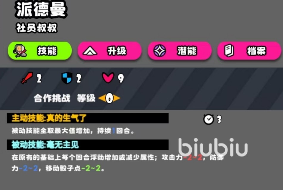 派德曼的核心机制源自被动技能:每回合开始时,其攻击力与生命值会基于上一回合结束时的对应数值,各自独立进行±2的随机浮动。这意味着单回合内可能出现四种组合——攻+2/生+2、攻+2/生−2、攻−2/生+2、攻−2/生−2。虽然存在双减风险,但其主动技能可完全规避该不确定性——一旦使用,当次被动触发必定为攻击力+2且生命值+2,形成稳定成长锚点,有效防止属性崩盘。