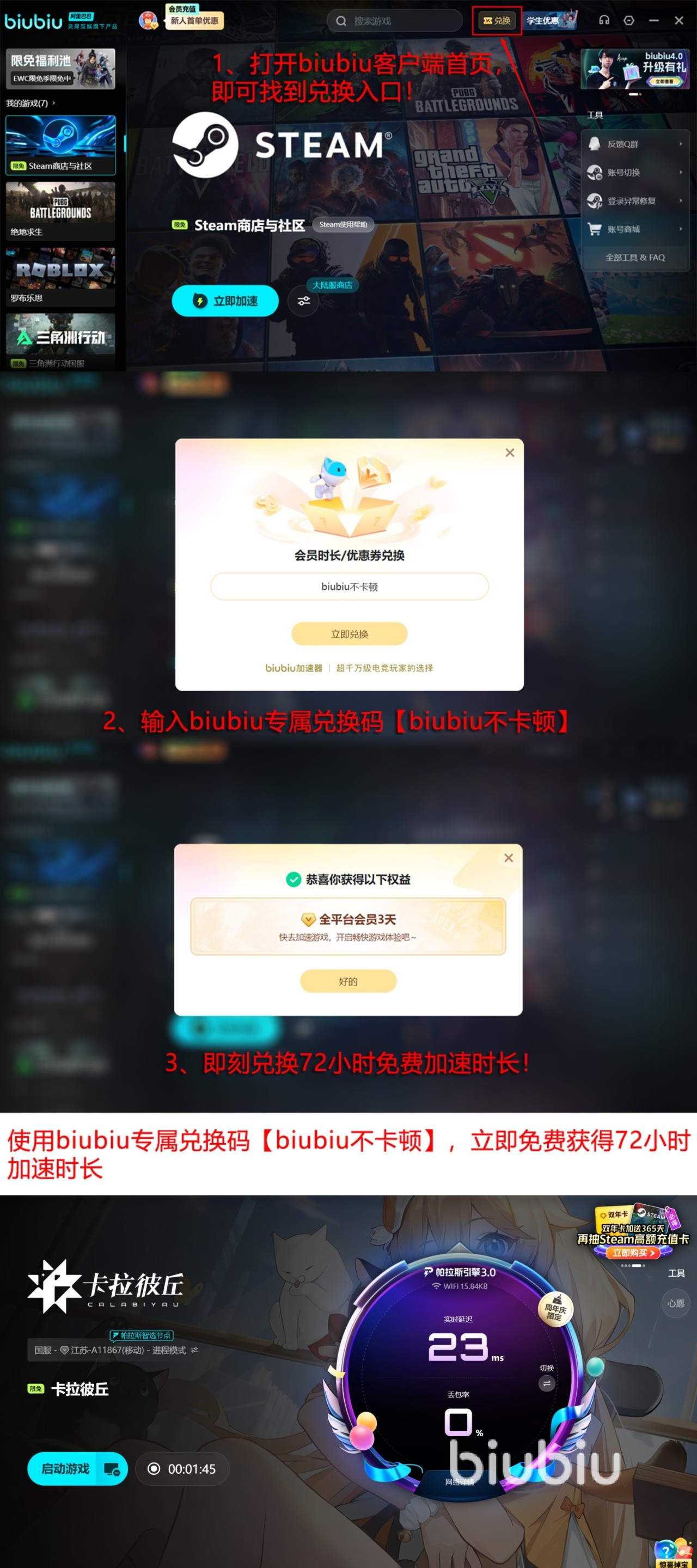 实际验证门槛极低:新用户注册即可获赠24小时全功能免费试用;叠加专属口令【biubiu不卡顿】还可额外领取3天加速权益。累计6天深度体验周期,足以覆盖多场完整排位赛程,直观判断闪退问题是否得到实质性缓解。此外,biubiu内置玩家交流社区持续更新《卡拉彼丘》进阶技巧、地图机制解析及设备配置指南;限免游戏加速区(具体支持列表以客户端内公示为准)亦同步开放,便于用户拓展测试其他联机作品,提升工具使用价值密度。