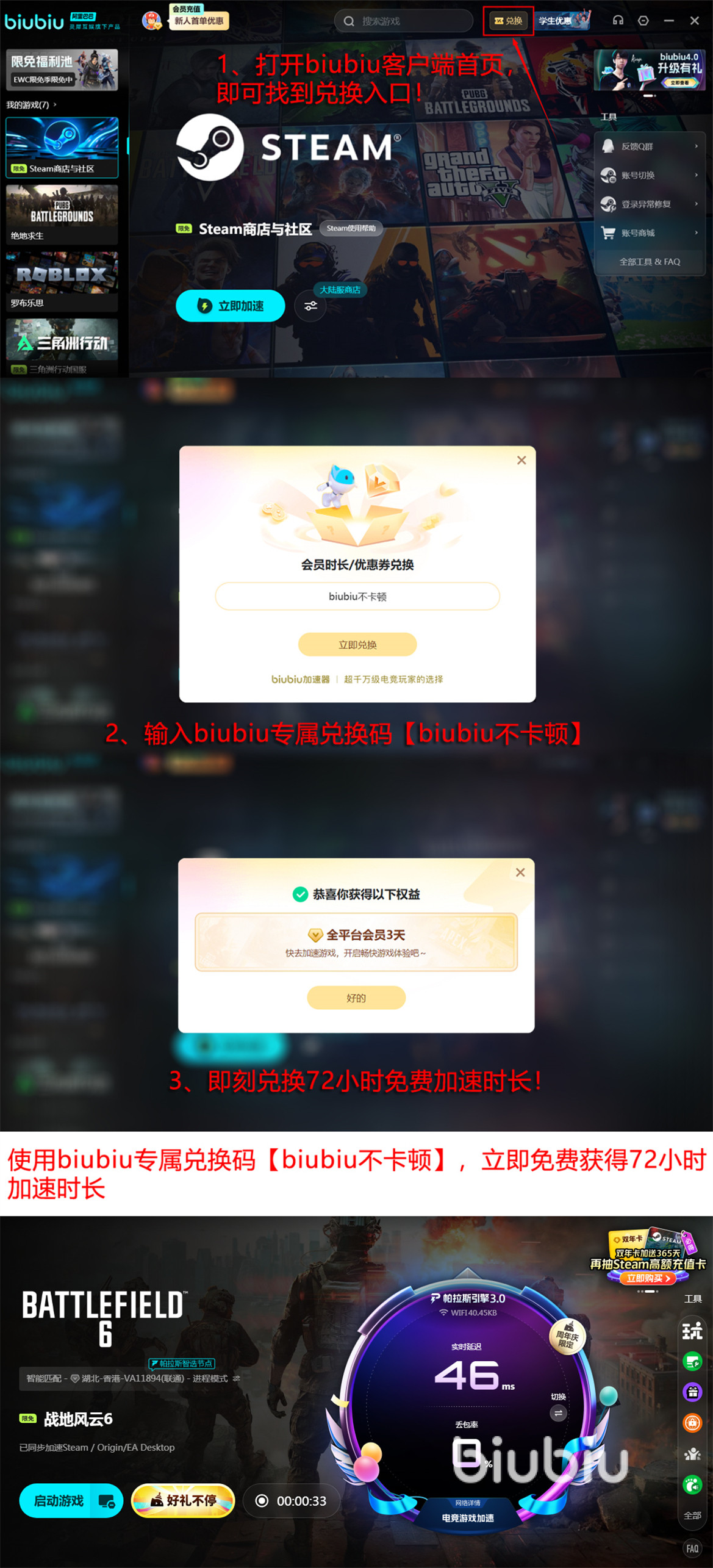 目前biubiu面向新用户提供双重体验权益:注册即赠24小时全游戏加速时长;另可凭兑换码【biubiu不卡顿】额外领取72小时加速权限。两项叠加后,新用户可享总计96小时免费服务,充分验证其在《战地6》64人/128人大战场中的实际效能。