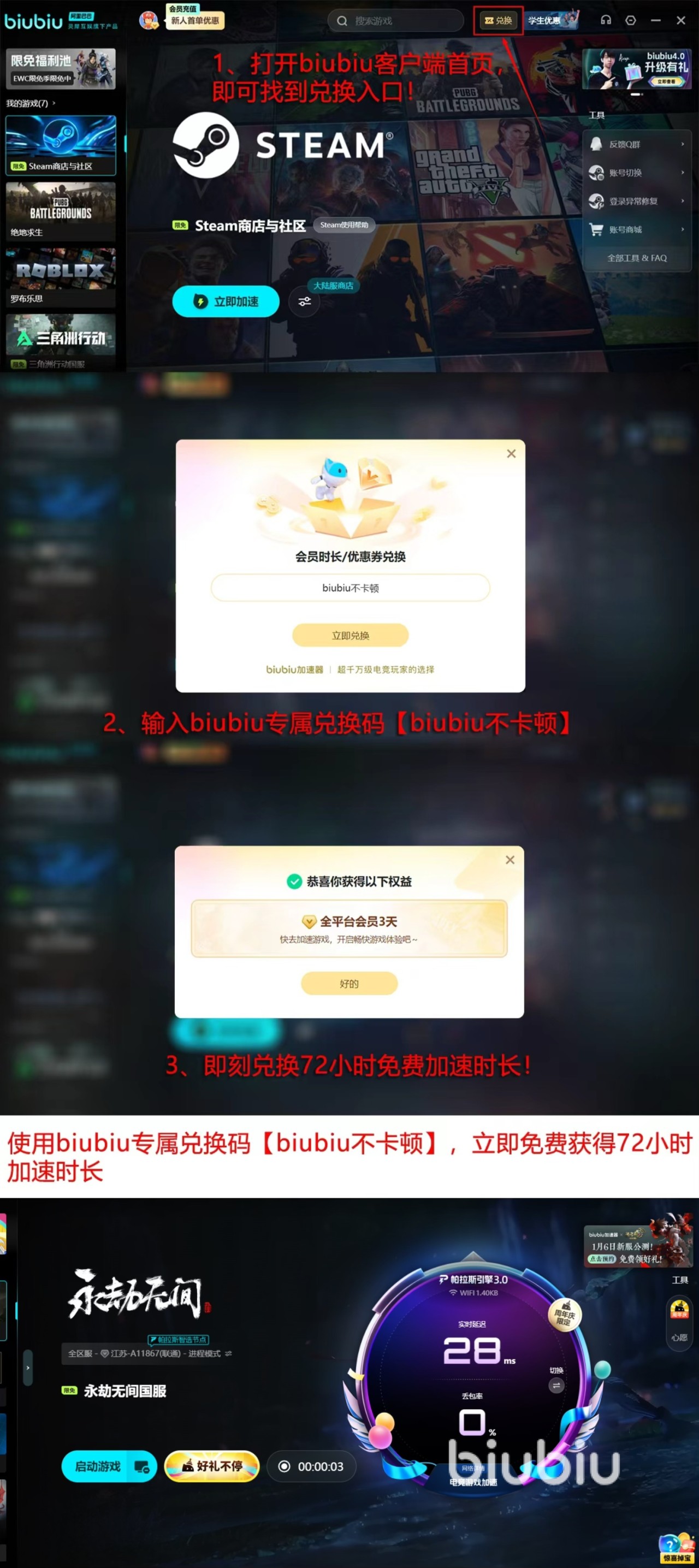 为降低体验门槛,平台同步开放限时福利:所有用户均可凭兑换码【biubiu不卡顿】领取72小时全游戏加速权限;新注册用户完成账号激活后,系统将自动发放24小时加速时长,无需额外操作,即刻验证优化效果。