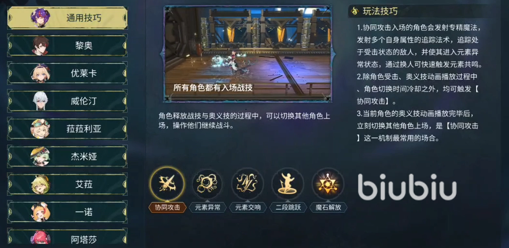 每位角色拥有专属入场战技,其效果各不相同;释放战技后可立即衔接奥义技能,并在奥义发动过程中完成角色切换,实现无缝协同作战。登场角色将自动施放专精魔法,该类法术具备多段追踪特性,可自动锁定并追击目标,显著提升中远距离压制效率。当攻击对象非同元素属性时,可使其进入对应元素异常状态;通过主动切换角色,玩家可在短时间内连续触发不同元素反应,形成高频元素共鸣链。需注意:角色切换按键设有独立冷却时间,但协同攻击本身不受冷却限制——当前角色释放大招后,须立刻切换至另一角色上场,此为达成协同连击的关键操作节点。