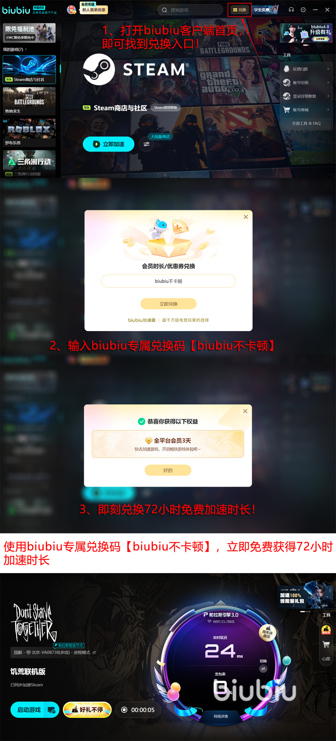 biubiu社区持续更新《饥荒:联机版》专项优化指南,涵盖MOD兼容性清单、服务器配置模板、常见报错代码解析等内容。新用户注册后可享24小时免费加速权益;另附专属兑换码【biubiu不卡顿】,每个账号限用一次,可兑换72小时连续加速服务。两项福利叠加,新用户总计可获得96小时无限制加速体验。