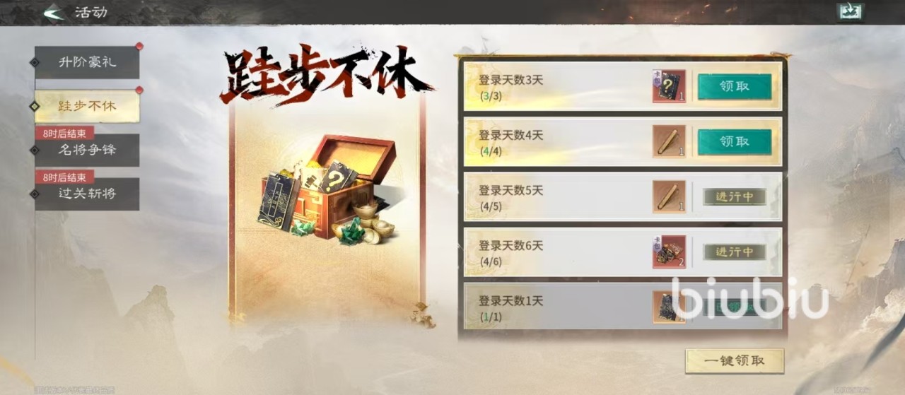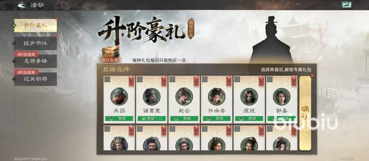 “升阶豪礼”活动支持玩家从诸葛亮、孙尚香、赵云、关羽四位名将中任选其一,激活专属养成礼包。选定关羽后,系统将发放升级材料包,助力精准培养,避免养成资源浪费。左上角“每日免费”按钮每日可点击领取英雄培养材料,全程零消耗。所有升阶礼包均设单日限购机制,定价亲民:例如诸葛亮升阶包仅需少量玉髓即可兑换突破所需道具。此外,“跬步不休”登录计划同步开启,连续登录即可分阶段获取道具与材料包,后续还将追加进阶奖励。