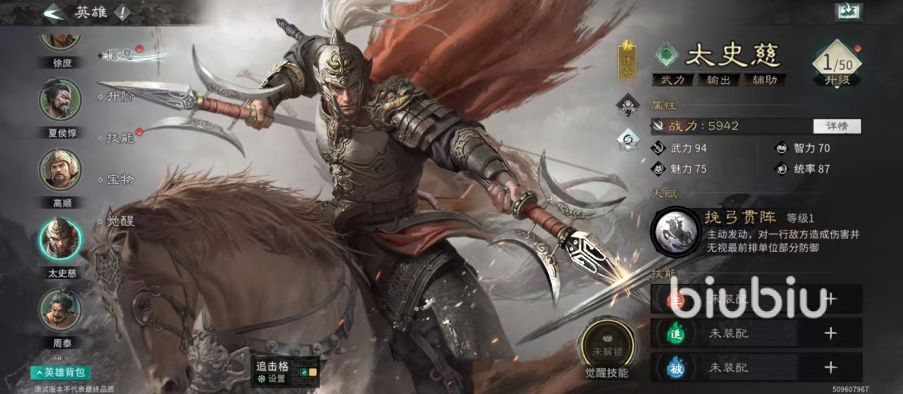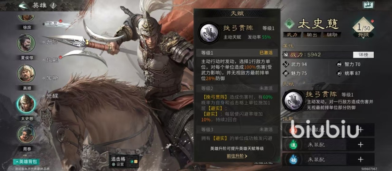 核心天赋“挽弓贯阵”是太史慈的战术支点。该技能1级即拥有55%发动概率,三回合内基本可确保至少触发一次。效果具备双重压制逻辑:第一,对敌方单行全体造成100%武力伤害,覆盖范围精准高效;第二,“傲世”效果可无视目标前排28%防御,大幅削弱高防坦克的承伤能力,为后续输出创造破盾窗口。若队伍中配置具备全队加速能力的武将(如携带群体提速被动或主动技者),可显著提升太史慈的出手顺位,最大化技能释放效率。