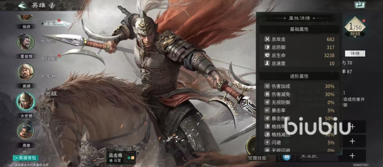 基础属性方面,太史慈当前武力值为94,配合682点总攻击与30%伤害加成,实际输出远超面板数值。统帅87、总防御317、闪避5%,整体生存能力处于同阶武将上游水平。需注意的是,其智力仅为7,在面对高频率法术控制时易被限制行动;速度仅有10,属于全队明显短板,必须依赖阵容中的提速型队友或增益技能进行补足。