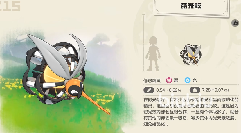 成功达成条件后,嗜光嗡嗡将进化为窃光蚊。此次蜕变带来三项关键强化:光感精度提升至可实时解析对手技能属性构成层级;新增被动【光谱解析】——当敌方精灵掌握的技能属性种类数每增加1种,窃光蚊释放的光系技能基础伤害即提升8%(上限叠加至5种属性,即+40%);该效果在对抗多属性配置的BOSS或PVP高配队伍时呈现显著压制力。