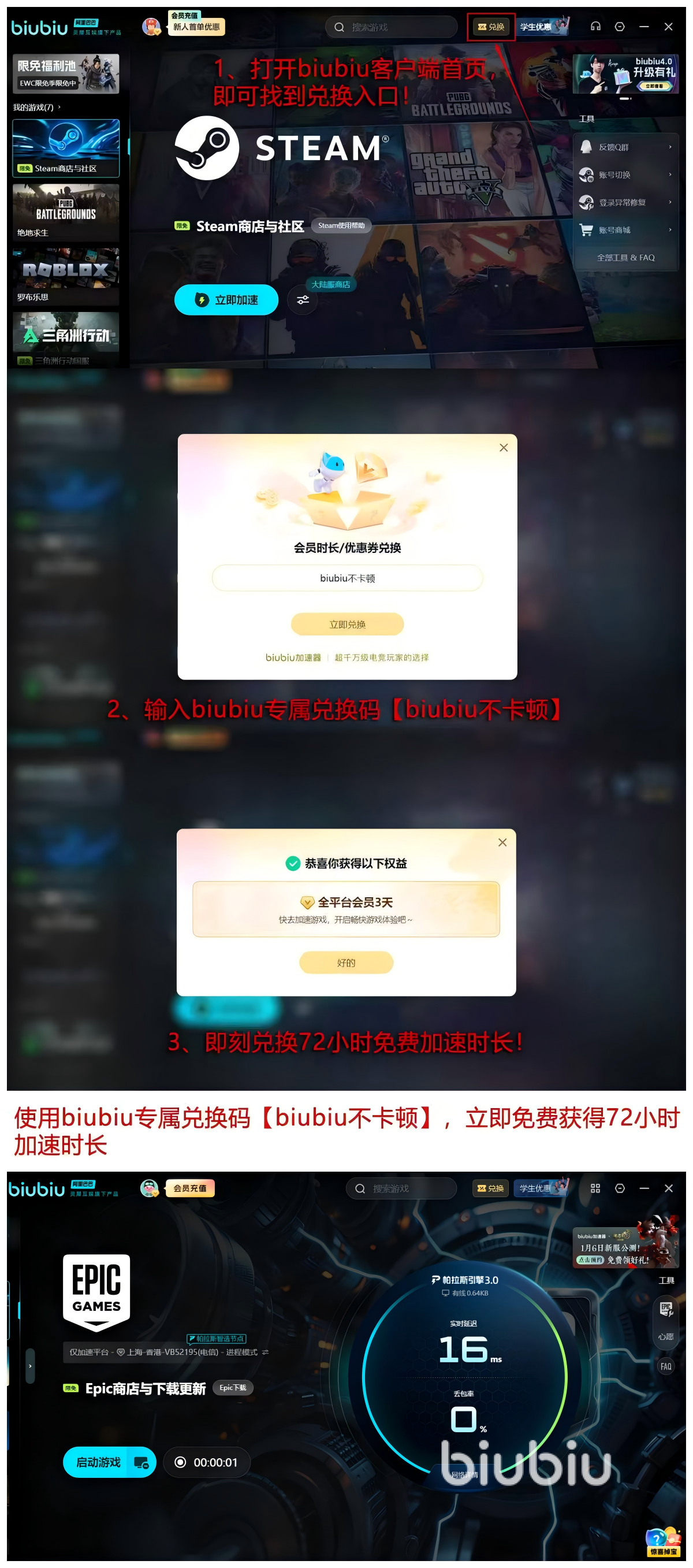【biubiu不卡顿】72小时可以按照下面的方法领取,新用户直接解锁24小时,总计96小时,四天的时间这些内容能够满足各位的多方位的需求,无论是想要下载一下网速慢得软件,还是要加速商店,都是非常得快速。