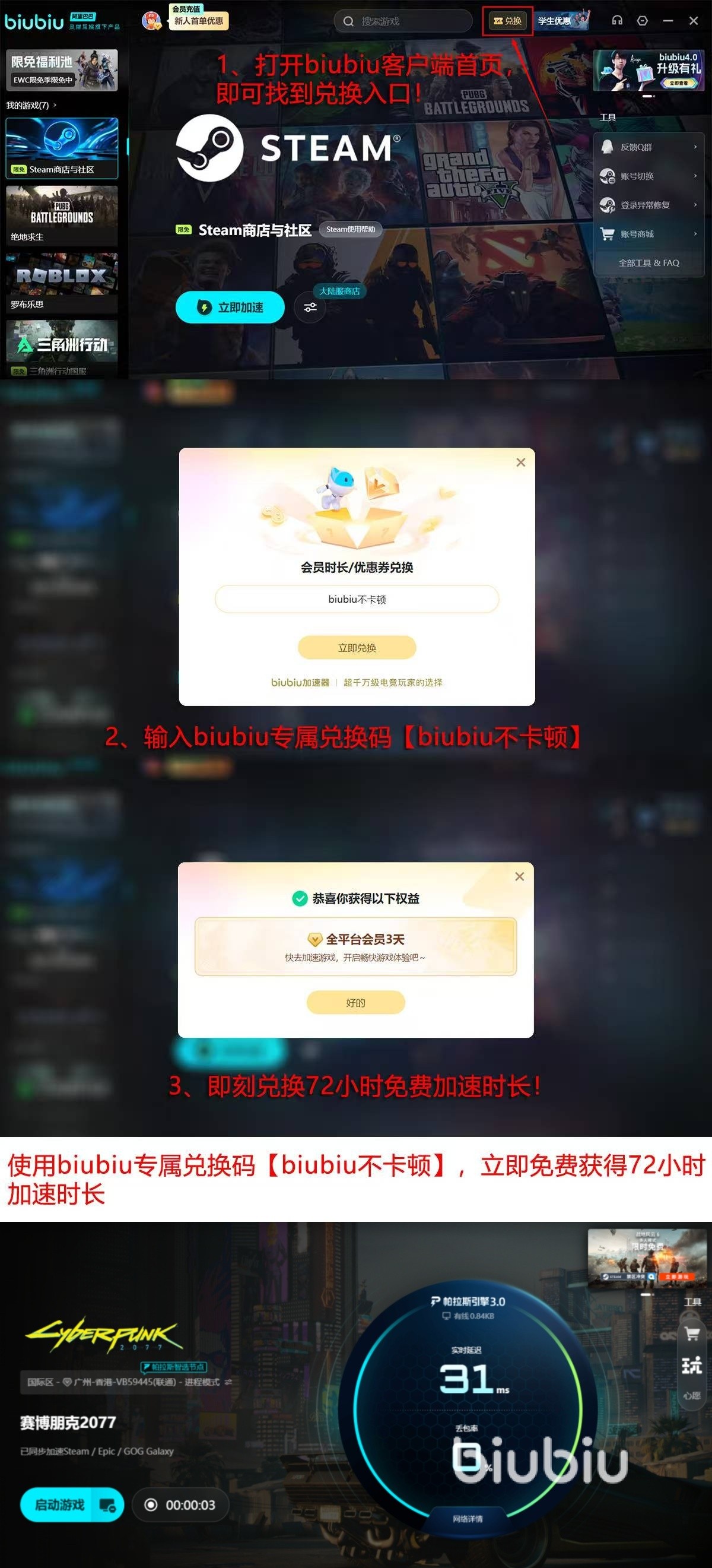 在使用成本方面,大家也不用过于担心,目前有着双重的福利机制,首先就是如果大家是新用户,进入其中进行注册就可以直接免费获取到1天的加速时长,另外使用【biubiu不卡顿】这个兑换码,不管是新老用户都能领取到3天的加速权限,这两者一起叠加,相当于新用户最高能获得96个小时,让玩家们能轻松无忧地享受到乐趣。