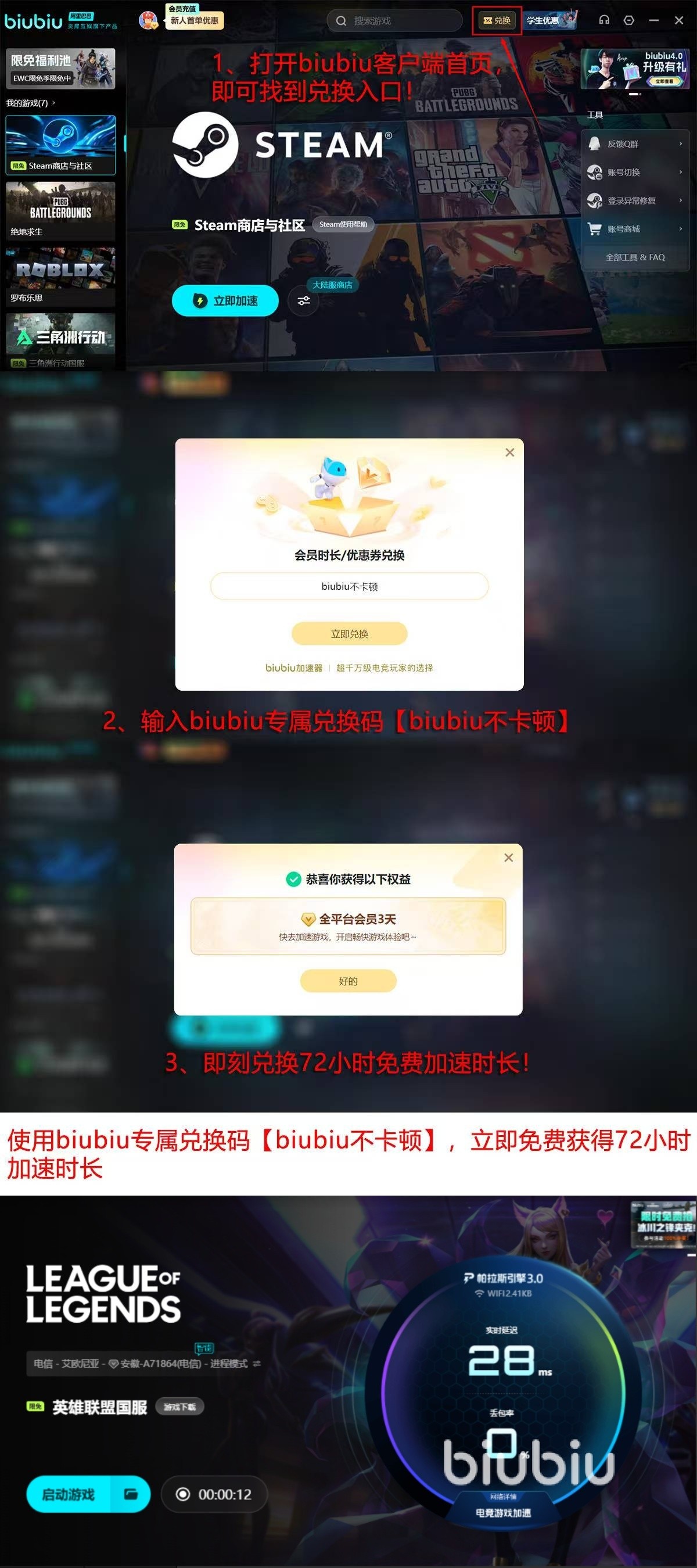 并且为了降低大家的体验门槛,biubiu加速器还推出了两项福利,第一项就是新用户在注册账号之后,可以直接享受一整天的免费加速服务,另外如果去输入【biubiu不卡顿】这一兑换码,就能再拿到3天的免费加速权益,全部一起总共会96个小时。