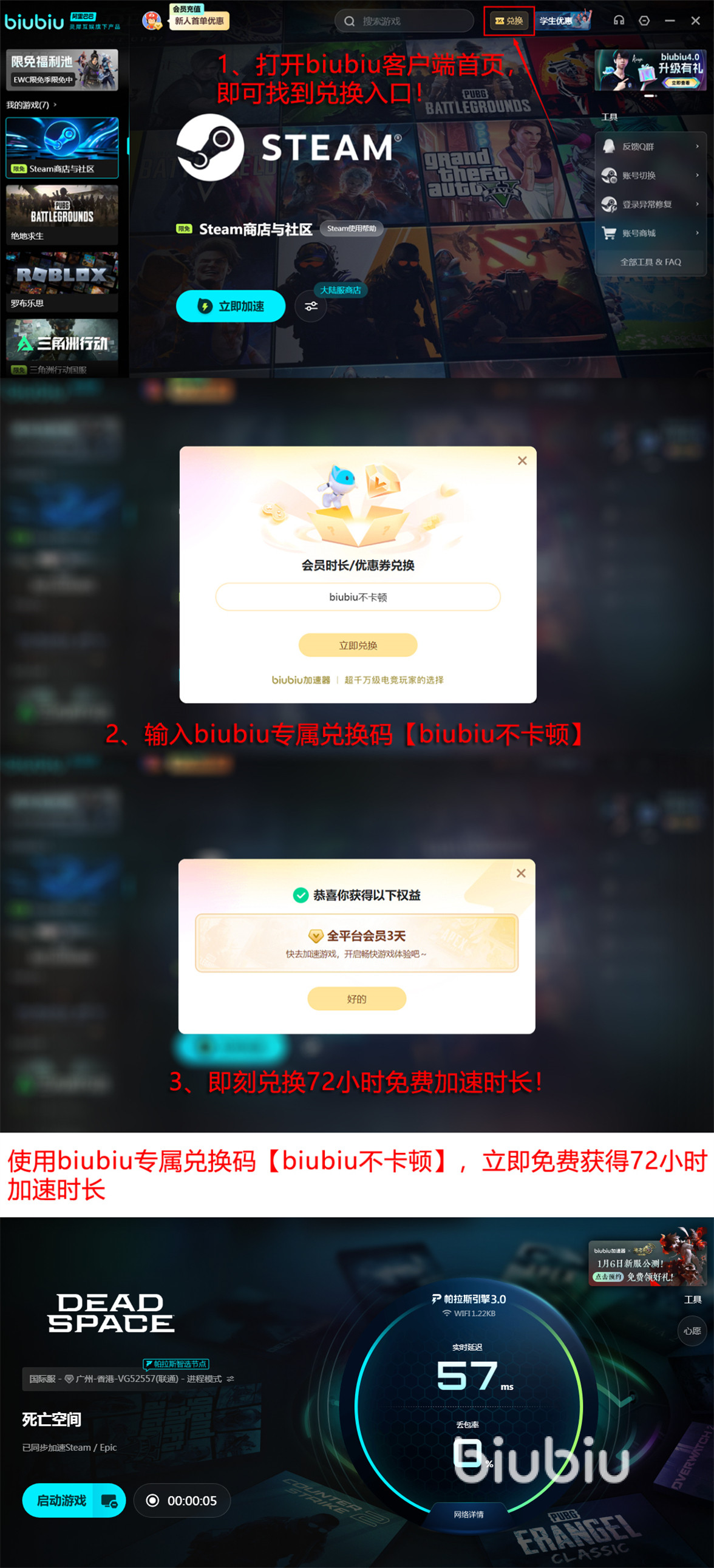 biubiu除了在性能方面达到业内最优的之外,在福利方面也处于绝对领先的地位,对每个刚刚注册的新号都赠送24小时加速时间,这样注册完毕直接就能免费使用。还为每个号都准备了一个兑换码【biubiu不卡顿】,能够兑换72小时加速时间。这样新号两项福利都能享受到,96小时的时长完全能够真实体验biubiu的性能。作为一款游戏加速软件,还免费提供了大量攻略,开放了一个人气很高的社区,这些都可以随时免费加入进来,利用这些内容来提升自己的游戏实力和知识。