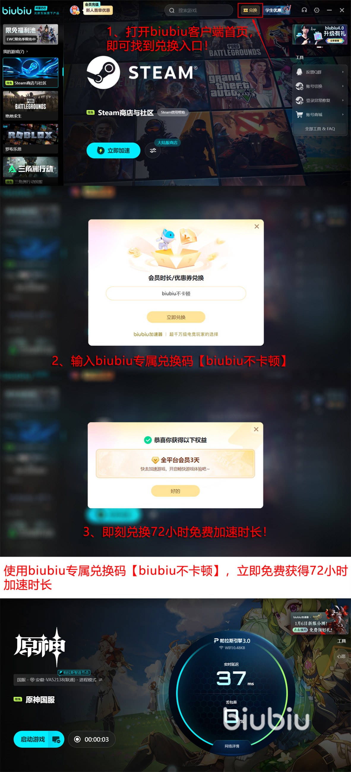 为了能够让更多人都可以体验到的真实加速性能,现在就可以注册一个新biubiu号,利用新注册用户免费加速24小时的福利先免费试用一下。还有一个兑换码【biubiu不卡顿】可免费换取多达72小时的加速时长,每个号都可以用一次,也非常关键一定要记住。