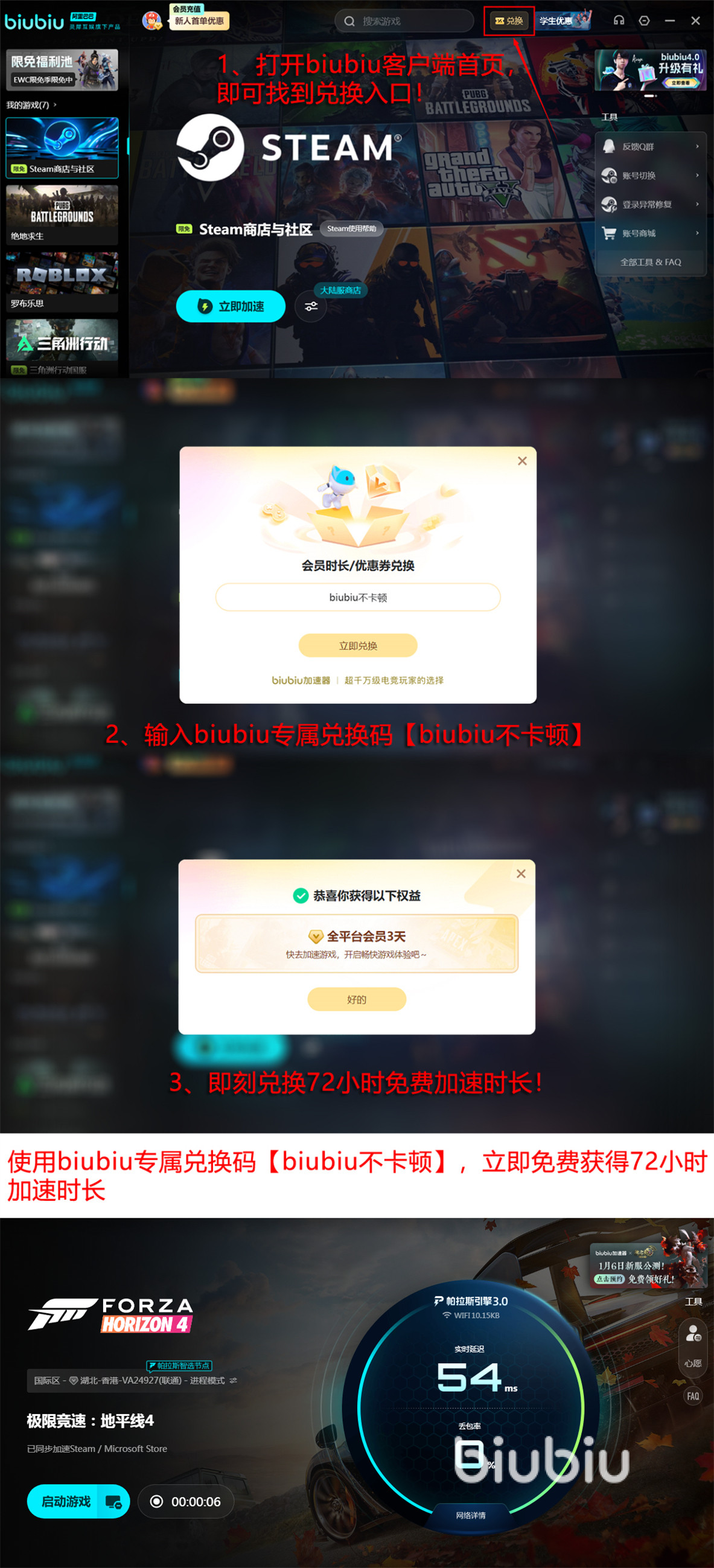 如果大家想要使用biubiu,暂时先不用着急续费充值,因为新注册的账号能免费加速24小时,还可以通过一个兑换码【biubiu不卡顿】,兑换72小时加速时间。而且这个兑换码是每个号都可以用一次的,所以之前的老用户也不要错过。