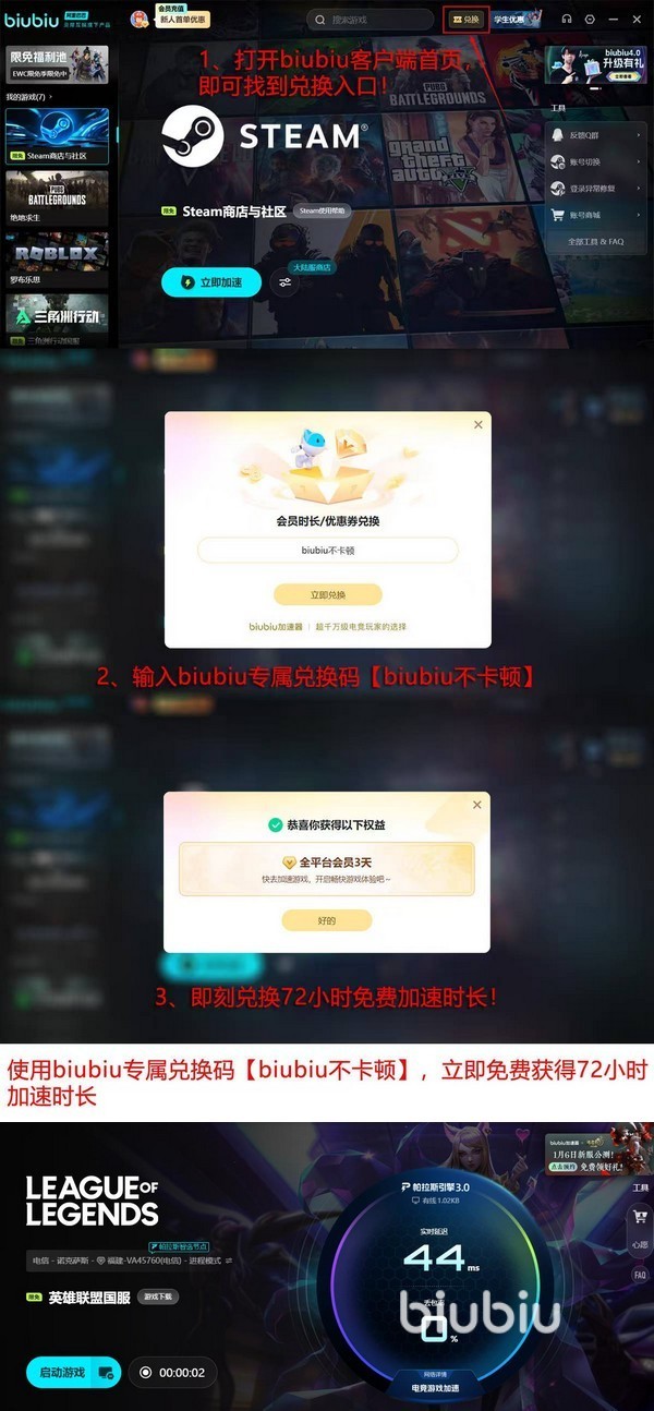 对于新玩家或者是想要体验其效果的人来说,它也是很友好的,提供了充足了免费试用时长,新用户在注册后会自动领取24小时的加速时间,这个是自动领取的,不论是否使用都会过期。但不用担心,还可以使用“biubiu不卡顿”兑换码来换取3天的免费加速时长,这个对新老用户都有效果,不过之只能使用一次,而且要区分大小写。