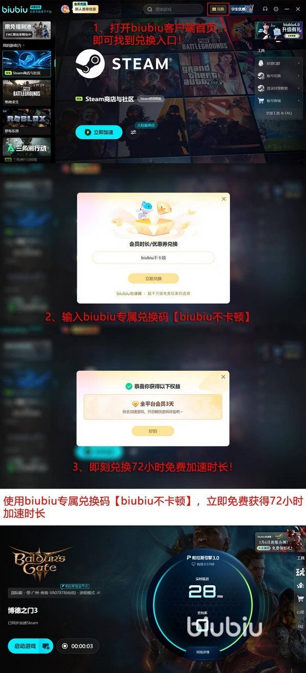 Biubiu本身就是支持steam平台的限免加速的,与此同时它在最近还迎来了重磅升级,全新3.0版本的帕拉斯引擎,由绝地求生冠军aixleft参与调优,带来电竞级的加速表现。还在犹豫是否要购入的小伙伴可以直接用“biubiu不卡顿”这个口令来换取72小时的体验时间,加上新用户注册就自动给到的24小时,足足有4天呢!足够大家去检验它的加速效果了。