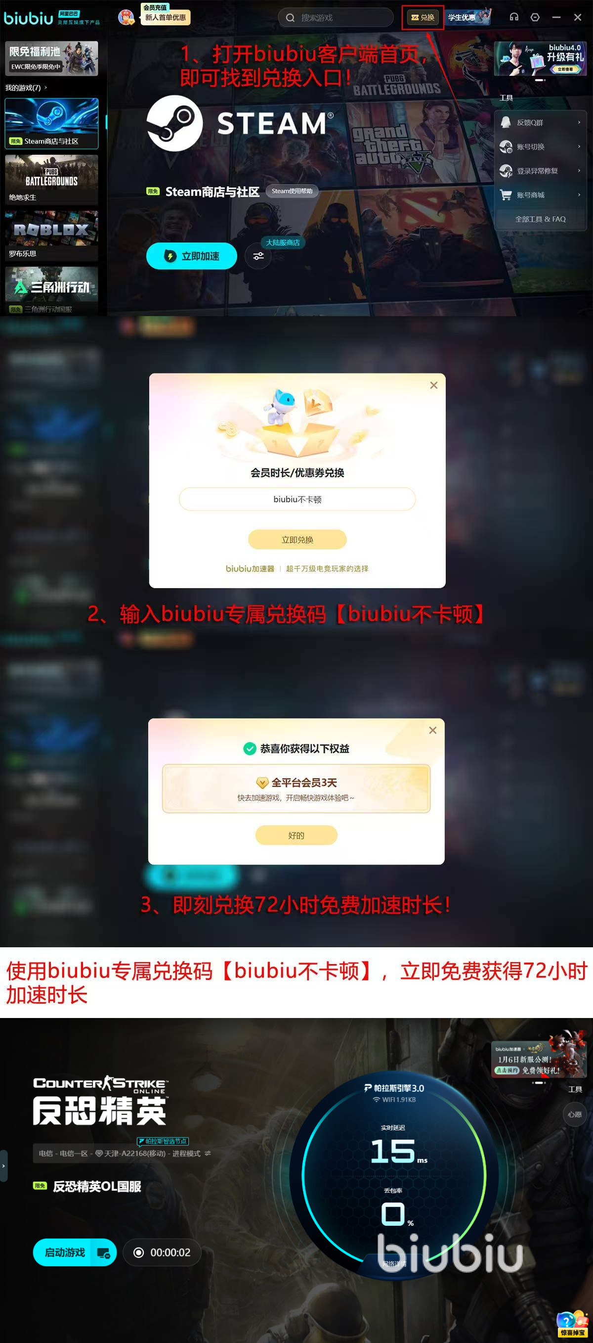 现在就是体验biubiu加速威力的好时机,平台推出了新人激励计划,立即注册就有无门槛专属加速24小时,输入【biubiu不卡顿】即可零门槛畅享高速网络72小时,两项活动叠加,轻松拥有4天免费加速体验,摆脱闪退卡顿,畅享丝滑战斗。