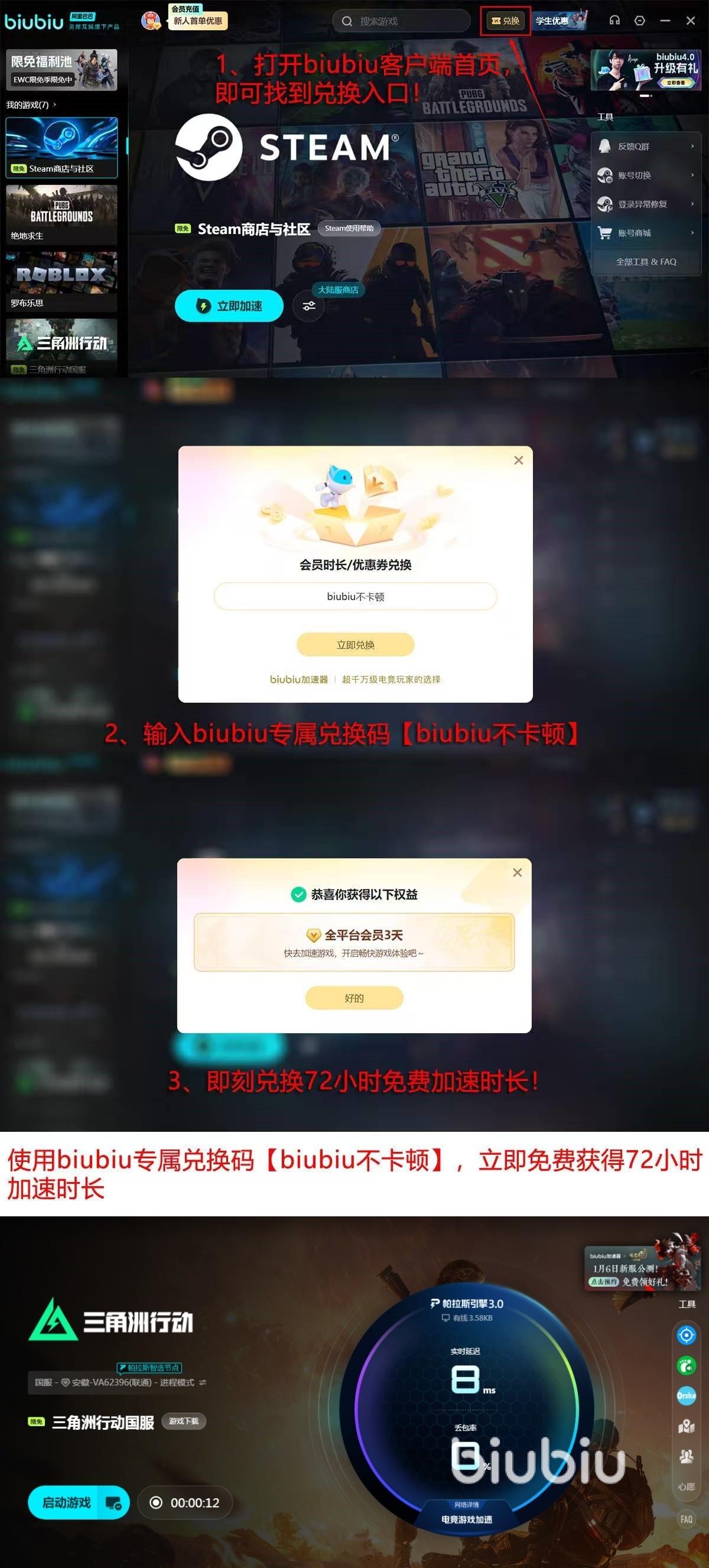 说到这,自然也有不少小伙伴心动,但是考虑使用经费的问题,这一点也很好的解决了,这里有免费福利可以想用,尤其是新注册账号的伙伴,直接就能拿到24小时免费加速,其他用户可以通过“biubiu不卡顿”作为兑换口令,再额外获得72H的加速时间,如果两者都能享受,那就是直接96小时,长达4天都可以加速,且是针对平台上大部分大型游戏。
