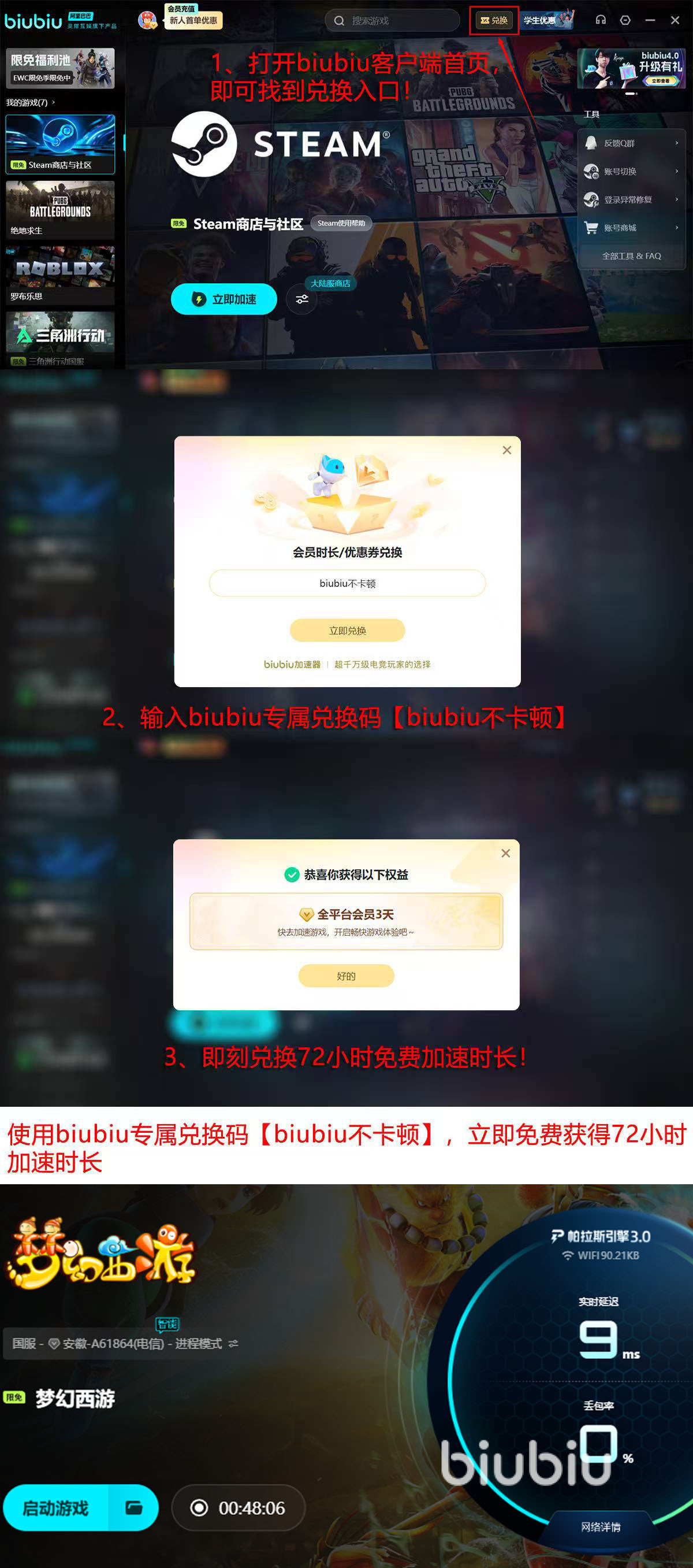 在使用biubiu之后,再进行梦幻的5开,将可以给与每一个账号,获取更多的网络资源,让游戏能够轻松的完成5开,而且还非常平顺,现在正在5开频繁掉线的烦恼的,现在何不领取4天免费加速时间尝试一下呢?获取方法还非常简单,新用户注册账号后就能直接得到系统送24小时,然后在打开客户端上的“兑换”弹窗,之后只要把【biubiu不卡顿】口令,复制或者输入到弹框里面,就能再得到72小时的时间,这样大家就能总共得到96小时了。
