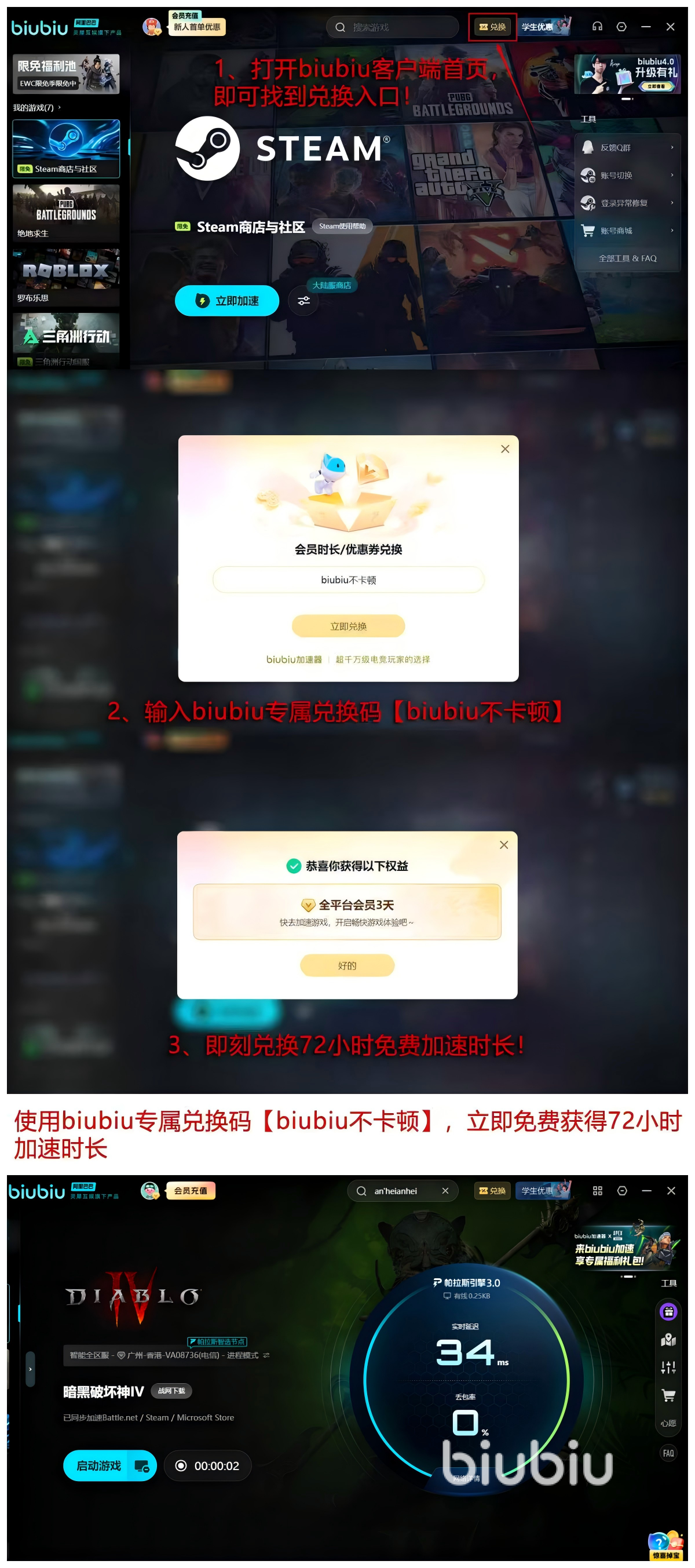【biubiu不卡顿】口令72小时轻松获取,新用户直接解锁24小时时间,算一下会有96小时的加速时间,福利时间内的所有体验都是和付费的用户同等,对于想要体验又害怕浪费钱财各位来说绝对是不容错过的一个体验,非常的适合所有的线上刚需用户,妥妥的的最便宜实惠兼具实力的加速辅助神器。