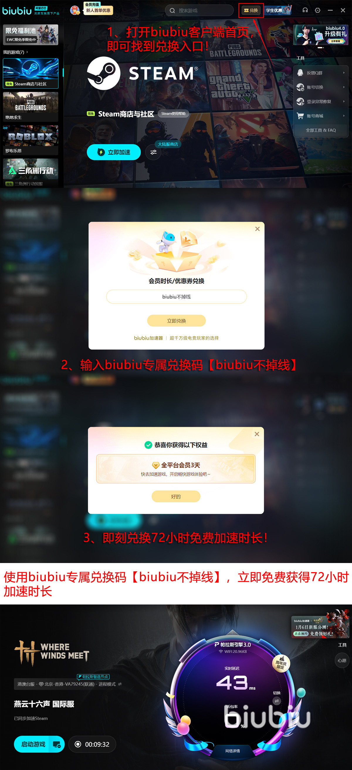 新用户完成注册后即可领取24小时免费使用时长;再通过【biubiu不掉线】活动还可额外获得72小时服务时间,合计共96小时无限制加速权益。