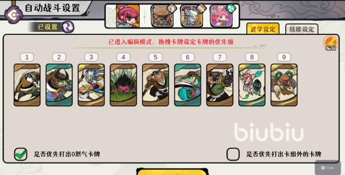 武学卡组共12张,含十面埋伏、灵猴棍法、破天刀法、弹指一刹、烈风斩、独行刀法各两张,构成8张图系卡与4张风系卡的复合结构。自动战斗中,技能释放顺序设定为:破天刀法→烈风斩→剑魔武学→十面埋伏→灵猴棍法→独行刀法→弹指一刹→玉兔武学→狂暴金狮武学。该序列兼顾伤害节奏、控制衔接与生存保障,可持续压制敌方血线,防止机制爆发。