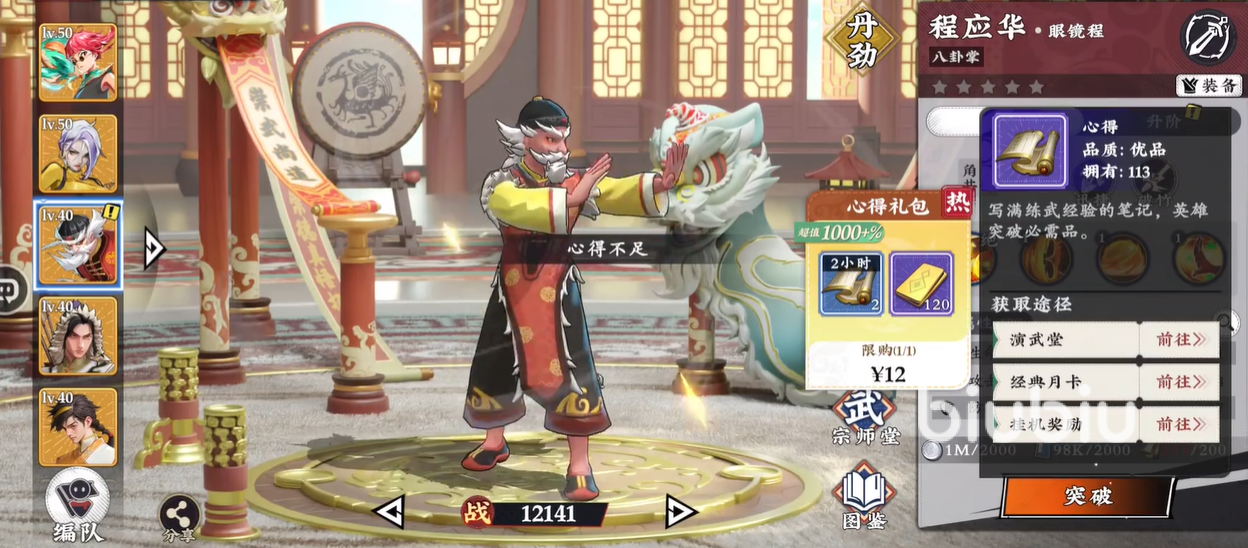 角色设定上,程应华被玩家亲切称为“眼镜程”,专属武学为八卦掌,具备显著的技能协同潜力——尤其与兰陎形成高频联动,在实战中可依据敌方阵型灵活调整己方武师站位,实现精准压制。升阶机制采用星级驱动模式:每提升1阶需累计5星,升阶后生命、攻击、防御三项主属性同步成长。因其输出定位明确,建议在资源分配中优先推进其等级与阶数,以加速队伍整体战力跃升。