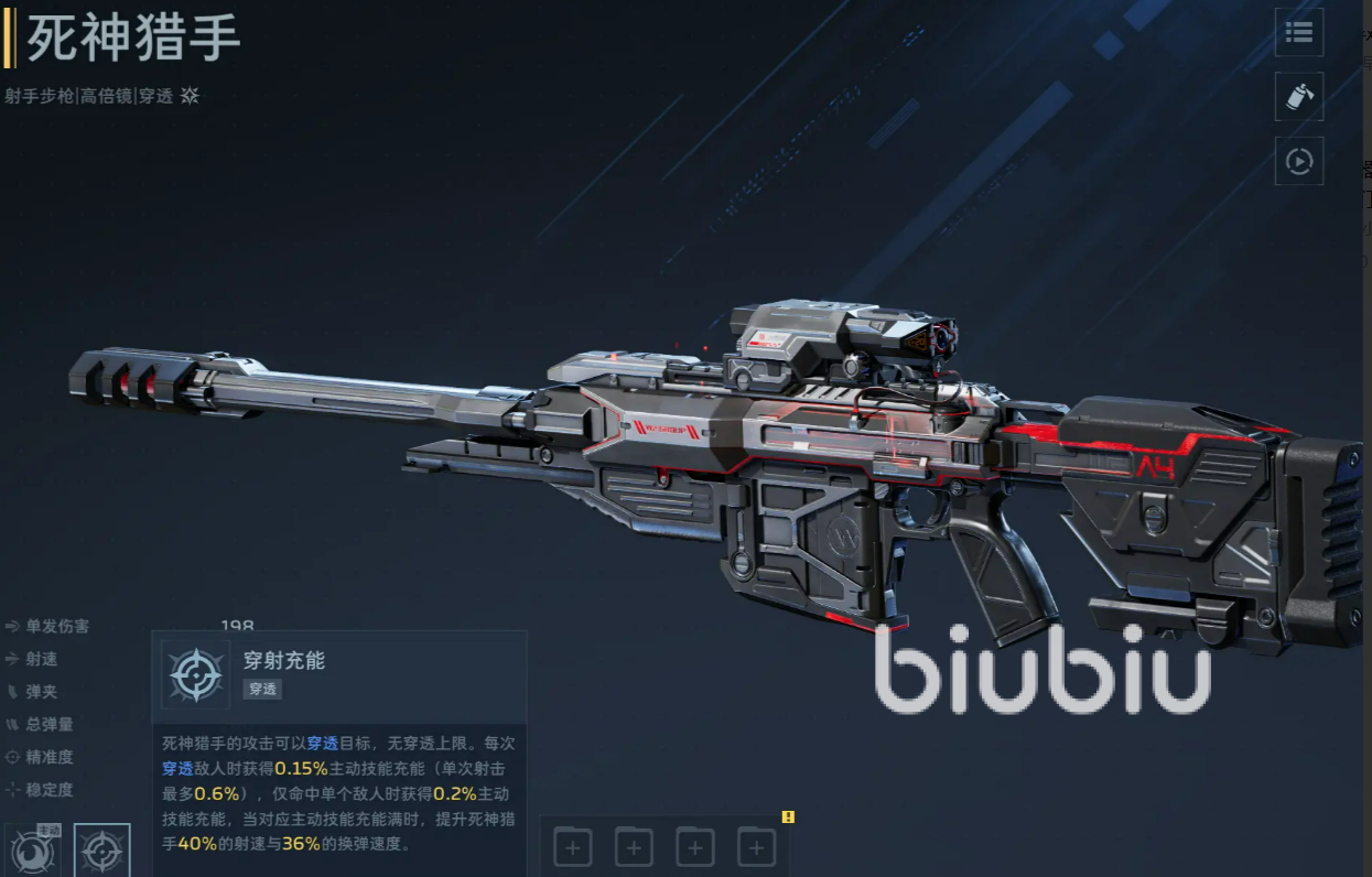 死亡猎手属于泛用性极强的全能型金色武器。开启主动技能后进入狂热状态,能量条立即充满,技能持续期间射击不消耗弹药且射速大幅提升。被动技能“强力弹药”支持默认六层穿透,且穿透过程中伤害完全不衰减;另设“极限穿透”效果,在能量激活状态下,穿透伤害额外提升58%,最高可叠加至98%增伤。此外,每成功命中五个目标,即自动补充10%弹夹容量并重置计数,形成可持续作战循环。该武器在PVE副本、生存挑战及塔防等多种玩法中均表现出色。