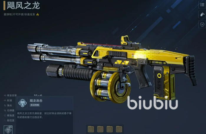 飓风之龙定位为塔防模式特化型武器。其核心优势在于爆发输出与范围清怪能力。主动技能可即时填满能量条,并触发四连发射击模式,显著提升单位时间火力密度;被动技能自动切换为龙炎弹形态,子弹命中后产生范围溅射伤害,对密集集群目标具备极强压制力。需注意的是,该武器实战表现高度依赖插件搭配,若未配置适配插件,整体效能将明显受限。