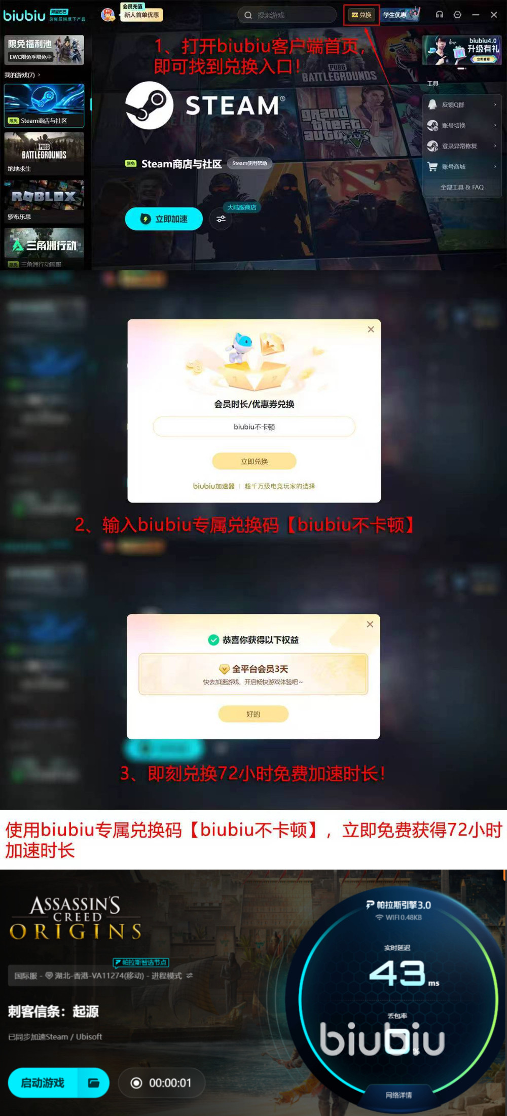 还没试过biubiu加速器的小伙伴,这次可别错过福利!新人首次注册,直接就能领24小时免费加速时长,不用花一分钱就能体验高速网络的快乐哦。知道大家在高速畅玩一天后,还会觉得不够过瘾,还多想体验体验,毕竟多试试才更放心。所以输入专属兑换码【biubiu不卡顿】,平台还会继续免费送大家3天的加速时间哦。前前后后算下来就有4天时间的免费体验哦,并不会像别的平台得做任务之类的,纯零门槛,自己亲自试过biubiu的保护下玩,就知道有多酣畅淋漓多好用了。